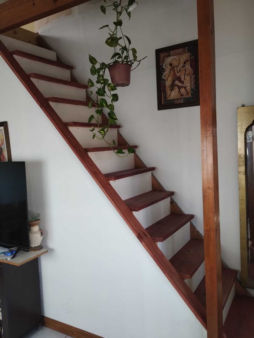 Cuenta con living, cocina, comedor, baño completo, y dos dormitorios en la planta alta. Tiene una cochera descubierta al costado del departamento.
